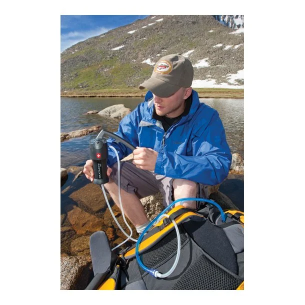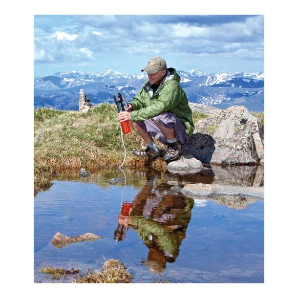 Dobbeltvirkende pumpefunktion med tre-delt filter: Keramisk pre-filter, aktiv kulfilter og 0,3 micron glasfiber membran, der fjerner 99,9 % af bakterierne. Denne model kan skrues direkte på Nalgene Wide Mouth drikkedunk.