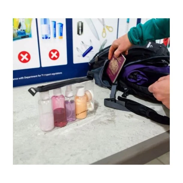 De nye regler for sikkerhed i lufthavne dikterer at alle væsker som transporters i håndbagagen, skal opbevares i beholdere under 100 ml (EU) og 90ml (USA), samt at disse skal anbringes i en klar pose eller taske. Dette sæt af flasker giver dig mulighed for at adskille dine væsker som fx sæbe og creme hjemmefra, således du ungår en uheldig situation ude i lufthavnen