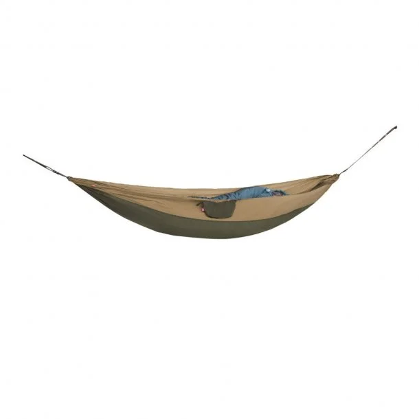 På pakkeposen finder du stropper, som kan bruges til ophængning. Disse er udviklet med refleksdetaljer, hvorfor hængkøjen bliver mere synlig om natten. Derudover gør stropperne det nemmere at montere denne uden på din rygsæk.
