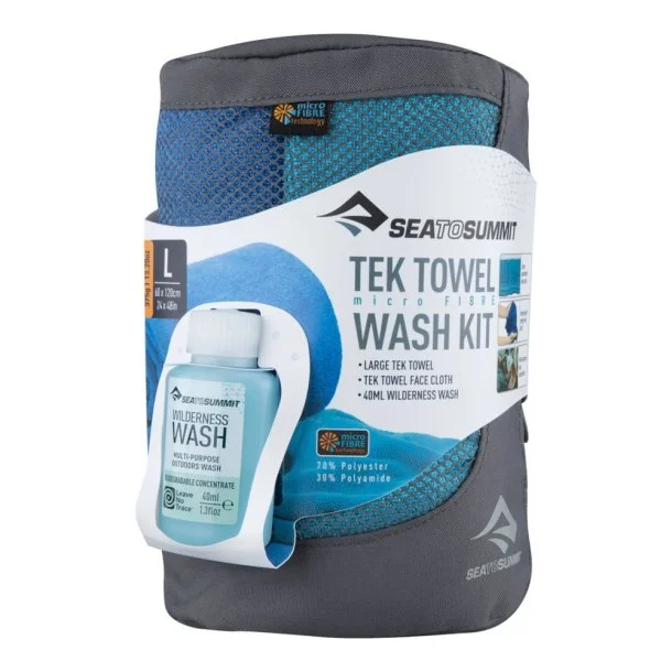 Sea To Summit – Tek Towel Wash Kit Large er det perfekte kit til dine outdoorture, så du kan holde dig frisk og ren. Kittet indeholder en vaskeklud på 30 x 30 cm, og et håndklæde på 40 x 80 cm, som begge er en del af Sea To Summits Tek Towel, hvilket betyder at det er et ekstra frottémateriale som gør dem ekstra absoberende.